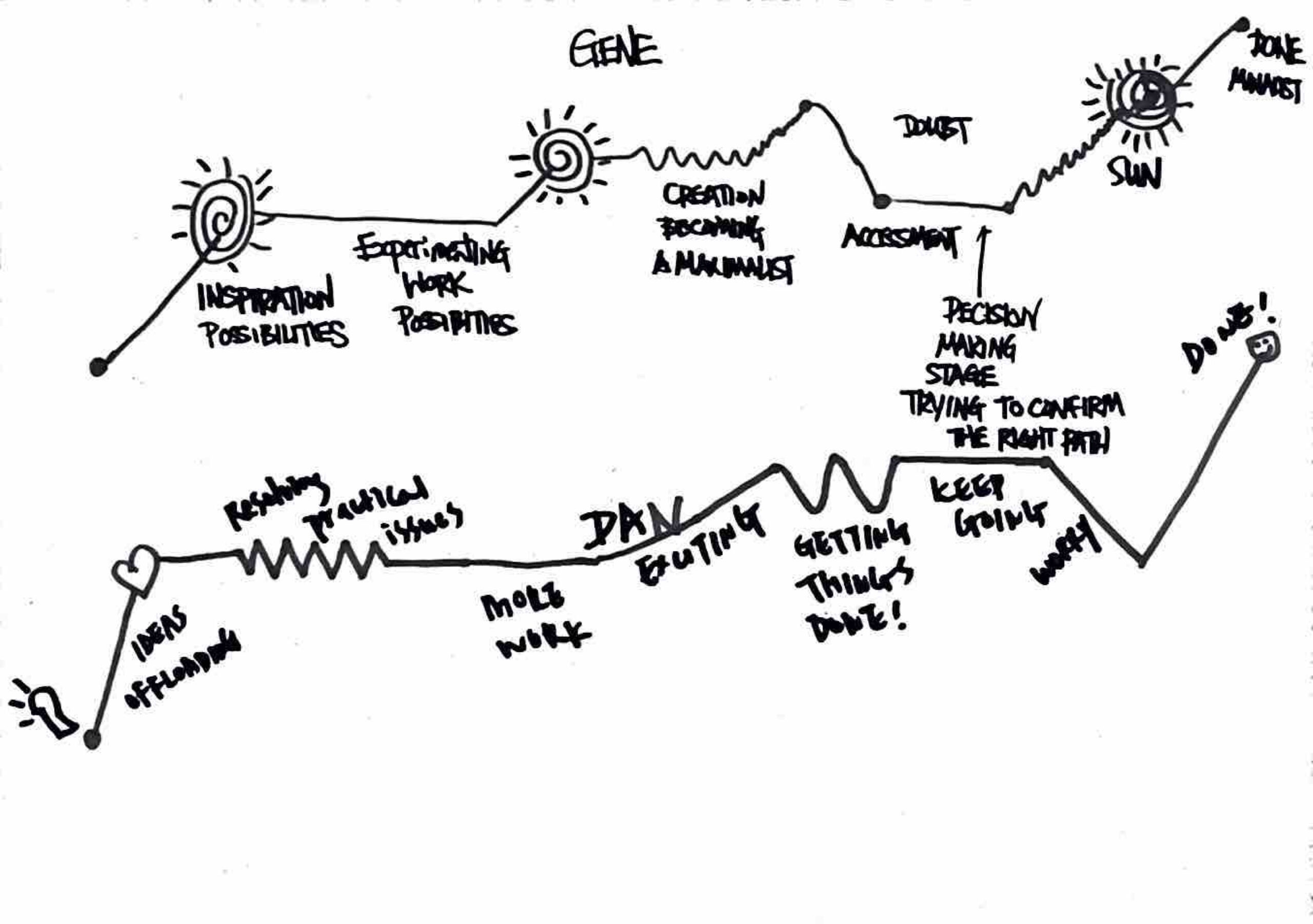 Dan’s is a zigzag. Sharp peaks, sharp drops, cutting straight from Ideas Overflowing through Resolving Practical Issues and More Work to Done with a smiley face. She describes herself as dependent on gut feeling, and found the forced analysis useful; a way to check whether the work had wandered from where it started. “Sometimes it goes on a different pathway,” she says.