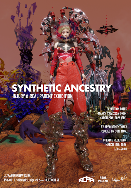 While Haymarket 2050 runs in Sydney, INJURY is simultaneously making its Tokyo debut. Synthetic Ancestry, showing at UltraSuperNew KURA through late March, is a collaboration with fellow collective Real Parent, marking both studios’ first exhibition in Japan. The Sydney project is an exercise in temporal archaeology; Synthetic Ancestry is an odyssey into AI consciousness and posthuman speculation. The exhibition is virtual and physical: 4K digital realms, 3D-printed metal, chrome plated resin. They call these objects contemporary talismans, things that exist as both digital souls and physical artefacts. At its centre is the INTERHUMANA series: three hearts. A transparent brain-heart for wisdom, a black heart for synthetic AI consciousness, a red heart for human emotion.