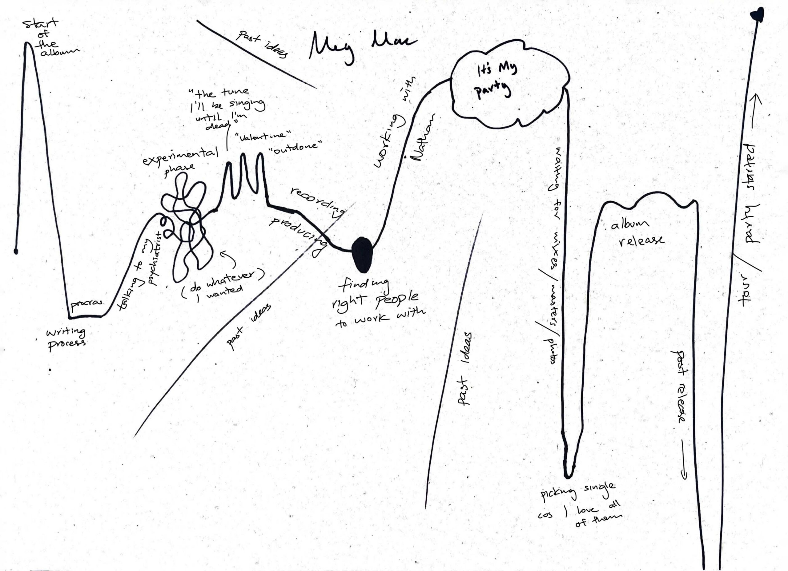 She did DRAFT Magazine’s Creative Heartbeat exercise, where she dragged a marker across a piece of paper, diagramming her album-making process in realtime, the surges and dips and stalls. She was surprised to find she’d rendered an arrhythmia. “Most interviews are just, what was the album process like? And you try and answer it quickly,” she says. “But doing the Creative Heartbeat, you really go into it, and you realise oh, it wasn’t linear and it definitely wasn’t easy.”
